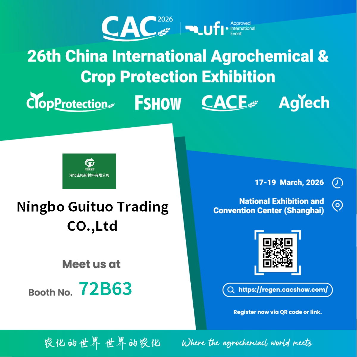 Ningbo Guituo Trading Co., Ltd. er stolte af at annoncere sin deltagelse i 26. China International Agrochemical & Crop Protection Exhibition (CAC 2026) . Denne prestigefyldte globale begivenhed finder sted fra kl 17. til 19. marts 2026 , på det nationale udstillings- og kongrescenter i Shanghai.